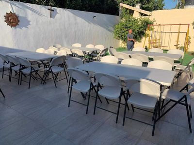 Este paquete incluye 32 sillas y 4 mesas cuadradas 1.82 metros, especial para fiestas y rebentones.